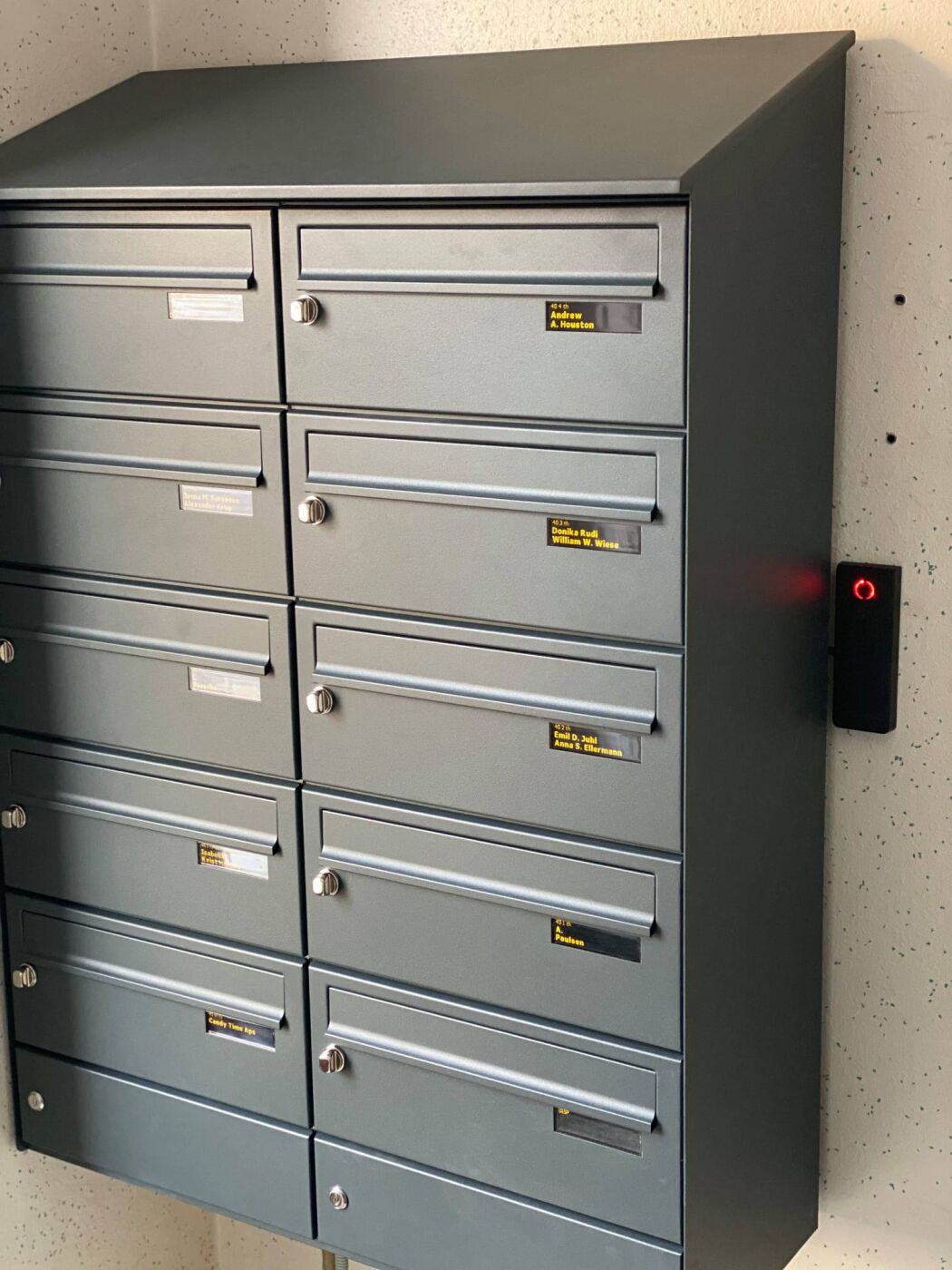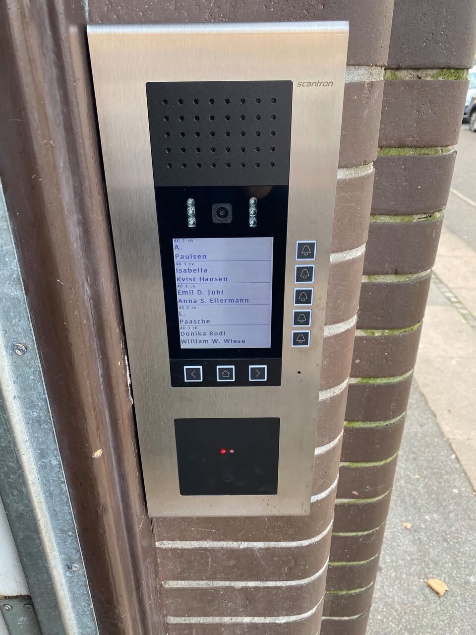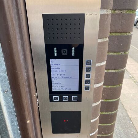 Vi har installeret et moderne Scantron dørtelefonsystem med video, hvor adgangskontrol og postkassestyring er fuldt integreret. Beboerne kan nemt se og tale med besøgende før døråbning, og med én nøglebrik kan de åbne både hoveddør og postkasse. Løsningen er desuden udstyret med digital navneskilt-administration, så administrator undgår manuel udskiftning og nøglehåndtering.