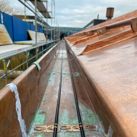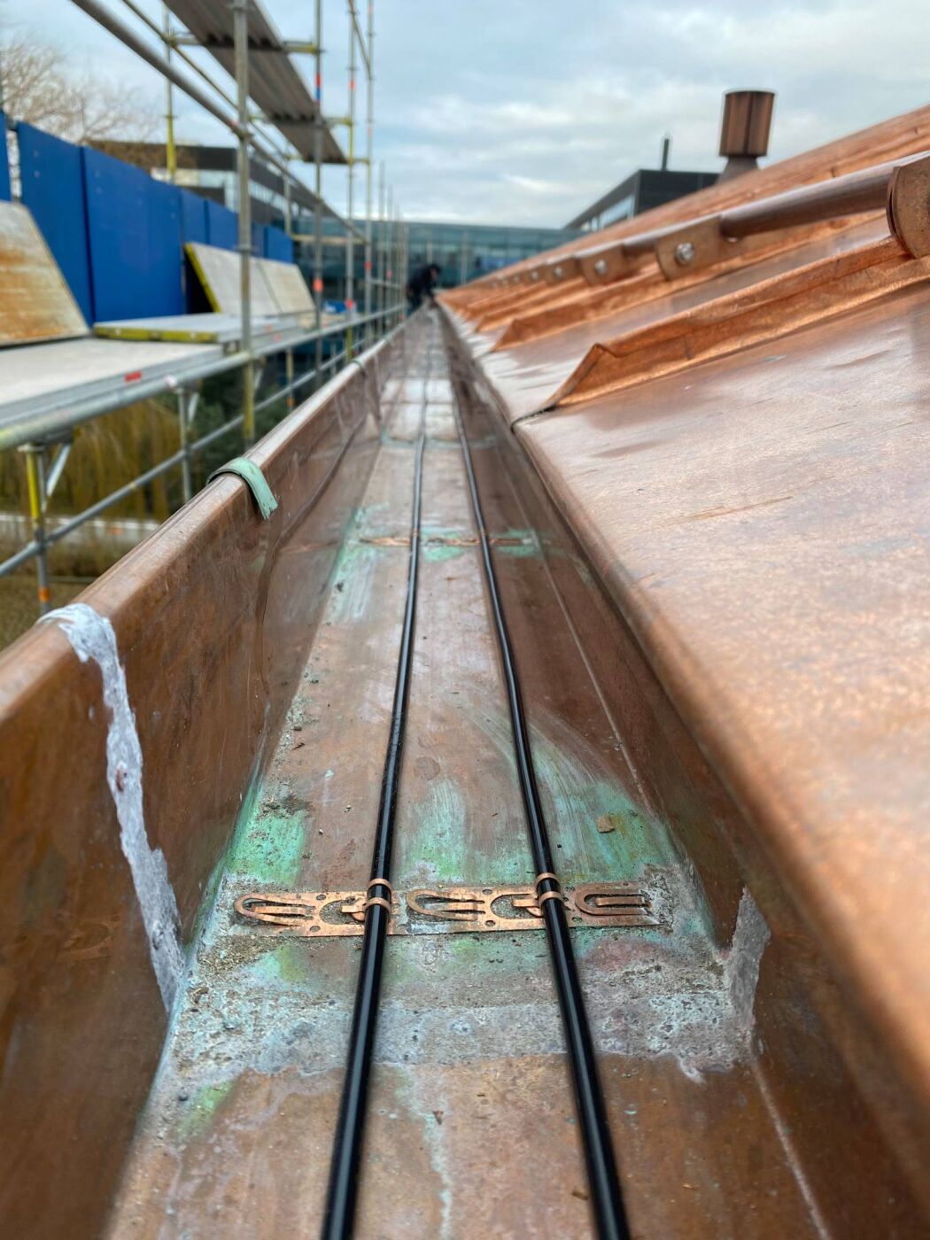 I forbindelse med bibliotekets nye kobbertag har Nordens Installation etableret varmekabler med automatisk styring i alle tagrender og nedløb. Med el-tracing undgår man både tilstopning, frostsprængninger og de sikkerhedsrisici, der kan opstå ved nedfaldne istapper.